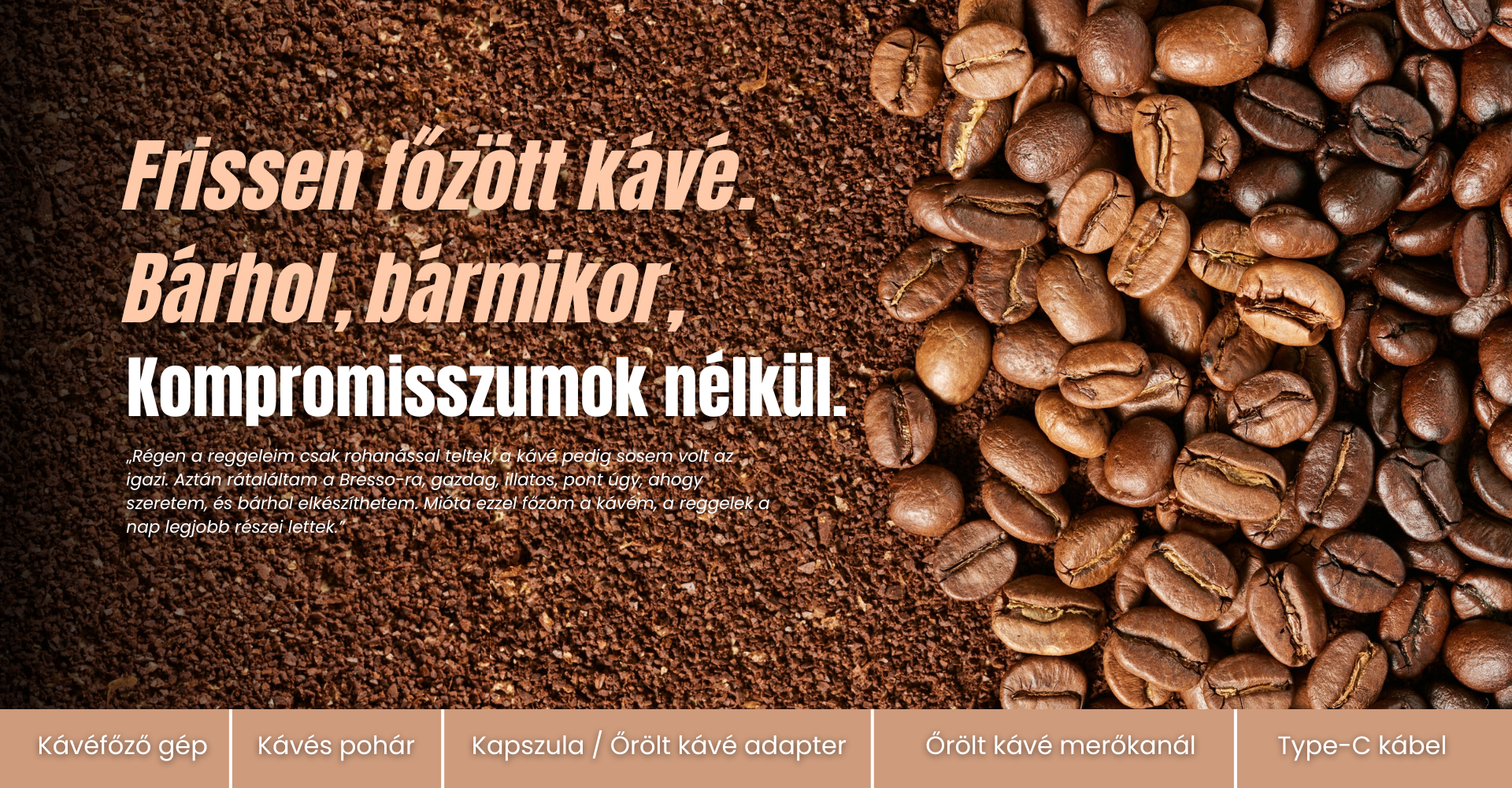 Különlegességünk abban rejlik, hogy egyetlen eszközben ötvözzük a kiváló minőségű kávékészítést, a letisztult, időtálló dizájnt és a valódi hordozhatóságot. A Bresso minden részlete tudatosan lett megtervezve: a megbízható működéstől kezdve az egyszerű használaton át egészen az esztétikus megjelenésig.