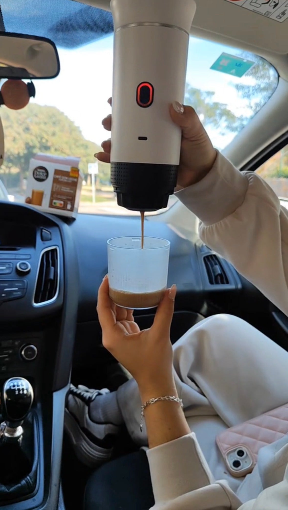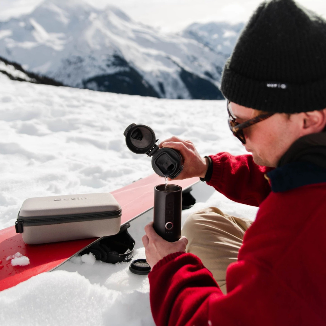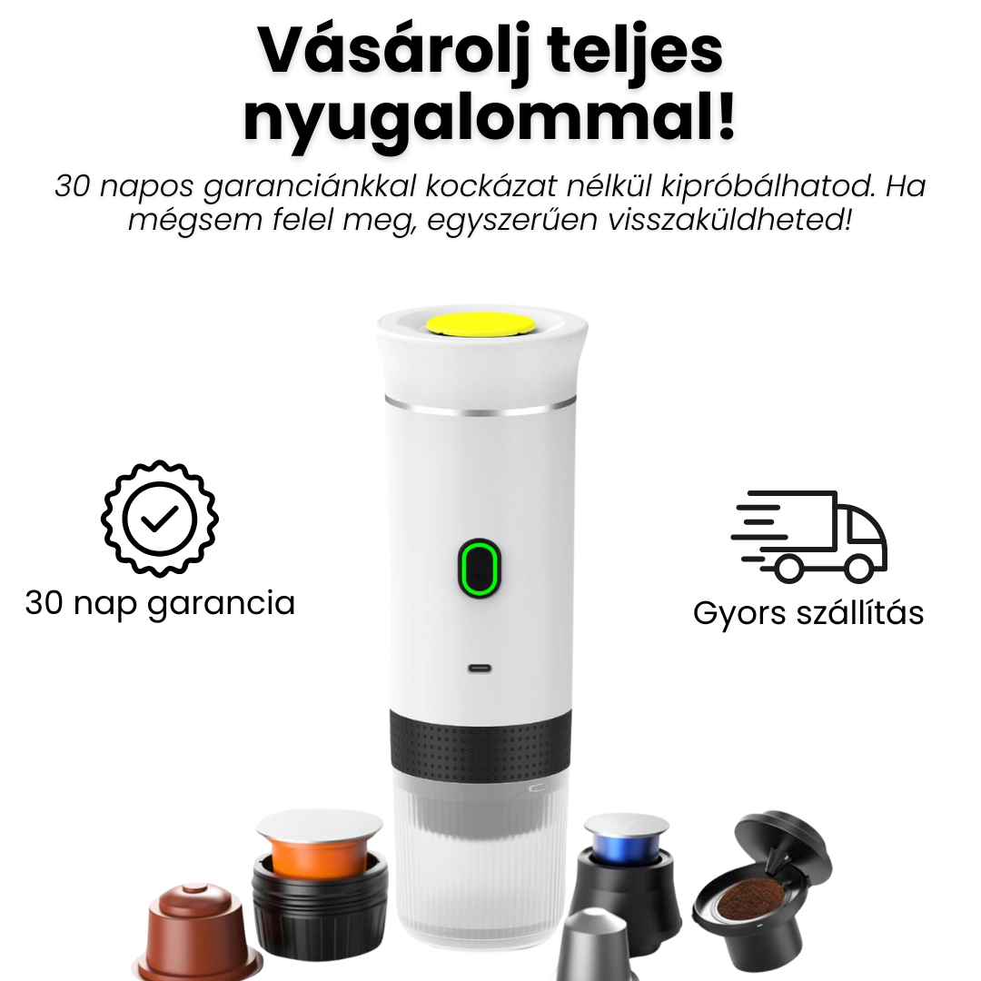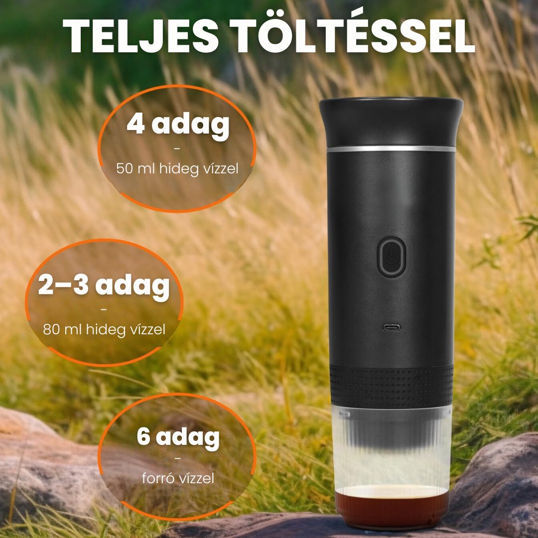 Minden, ami a tökéletes kávézáshoz kell: hordozható kávéfőző, stílusos kávéspohár, fejek kapszulákhoz és őrölt kávéhoz, töltőkábel, kiskanál, valamint egy ajándék hordozótáska.